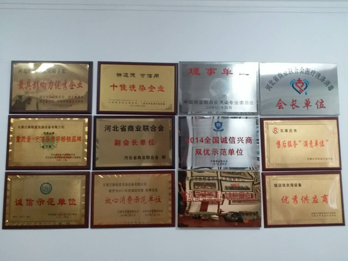“奧運獎牌”是證明了一個運動員的競技能力,“吉尼斯證書”證明了一個人在某一項事件中是人,而石家莊新航星洗滌設備公司的“榮譽墻”則證明了公司的實力。"誠信示范單位"證書和"放心消費示范單位"證書說明石家莊新航星是一家值得信任的公司,講信用守誠信;"售后服務滿意單位"證書肯定了石家莊新航星的售后服務質量;"蕞具影響力企業"證書和"十佳洗染企業"證書體現了石家莊新航星作為洗染行業的一員,為行業所作出的貢獻。